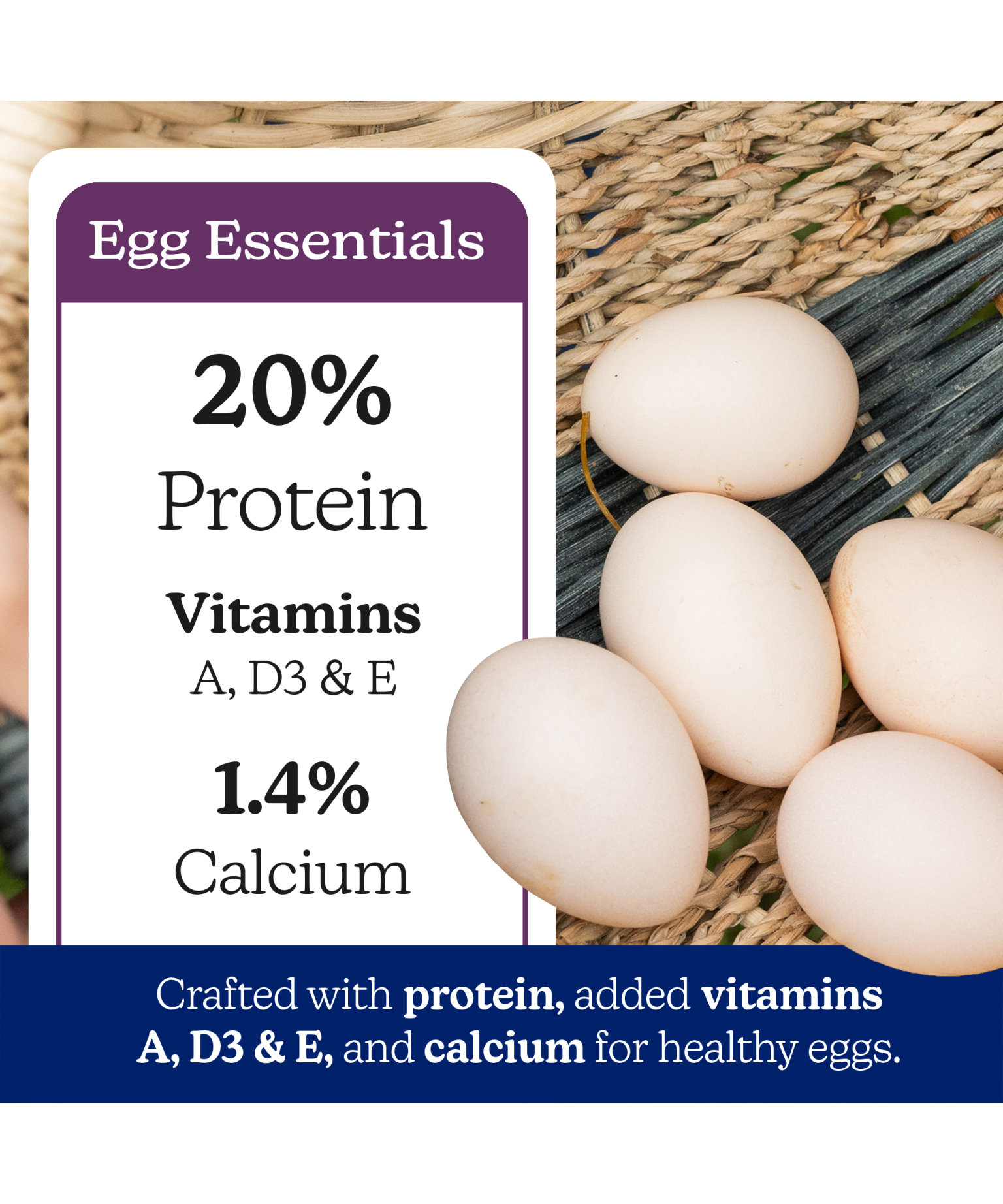 With 20% protein, vitamins A, D3, & E, and 1.4% calcium, our feed has what your hens need to continue laying healthy eggs with bright yolks.