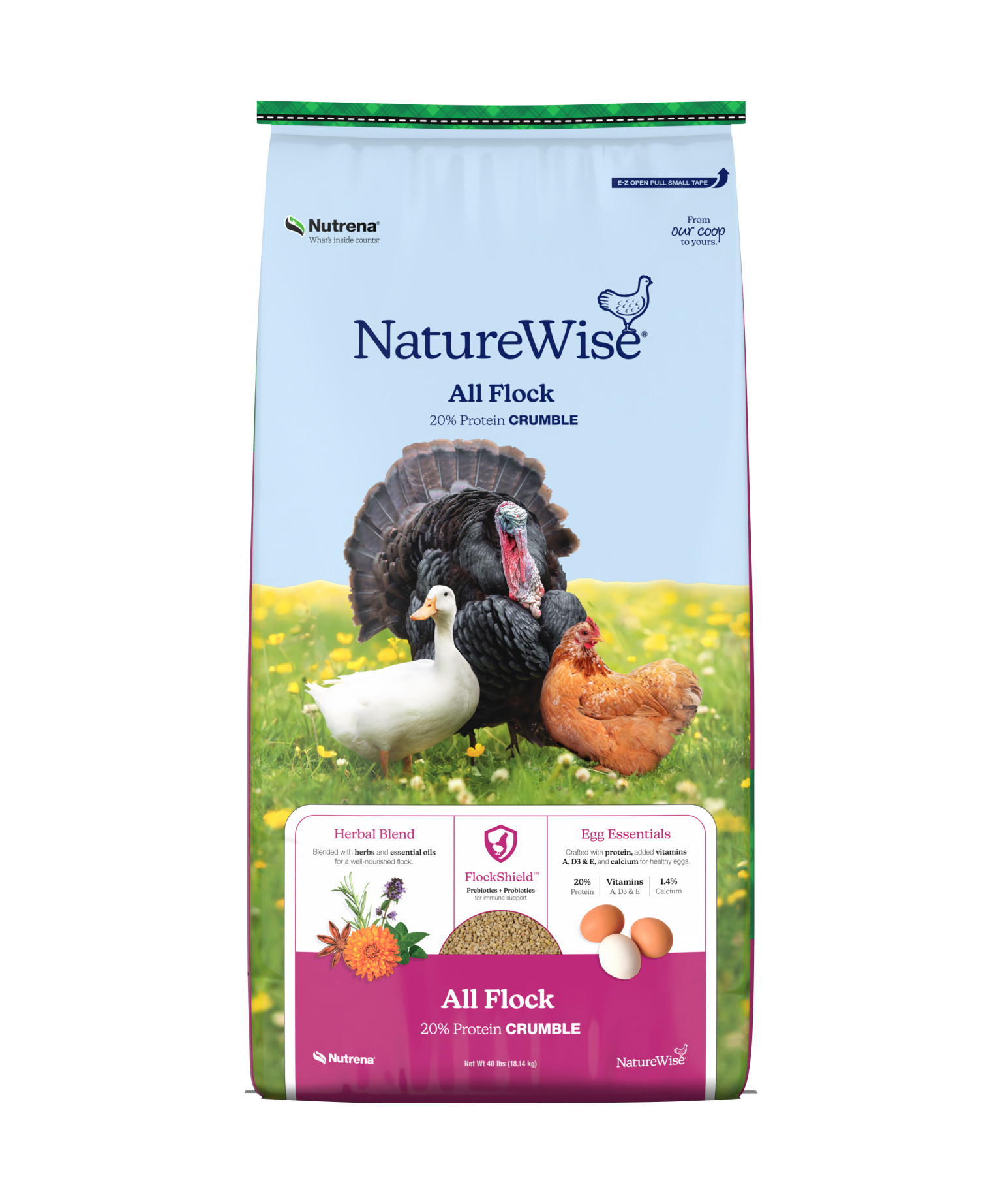 Nutrena® NatureWise® All Flock 20% Protein Crumble provides complete nutrition for mixed backyard flocks, including layers, turkeys, ducks, geese, and pheasants over seven weeks old. With 20% protein and 1.4% calcium, it supports strong growth, vibrant health, and steady egg production across diverse species. The crumble form is easy for birds of all sizes to eat and encourages natural pecking behavior. Enriched with our Herbal Blend and FlockShield® for immune health, digestion, and nutrient absorption, this balanced, multi-species feed gives every bird in your flock the advanced nutrition they need to thrive.