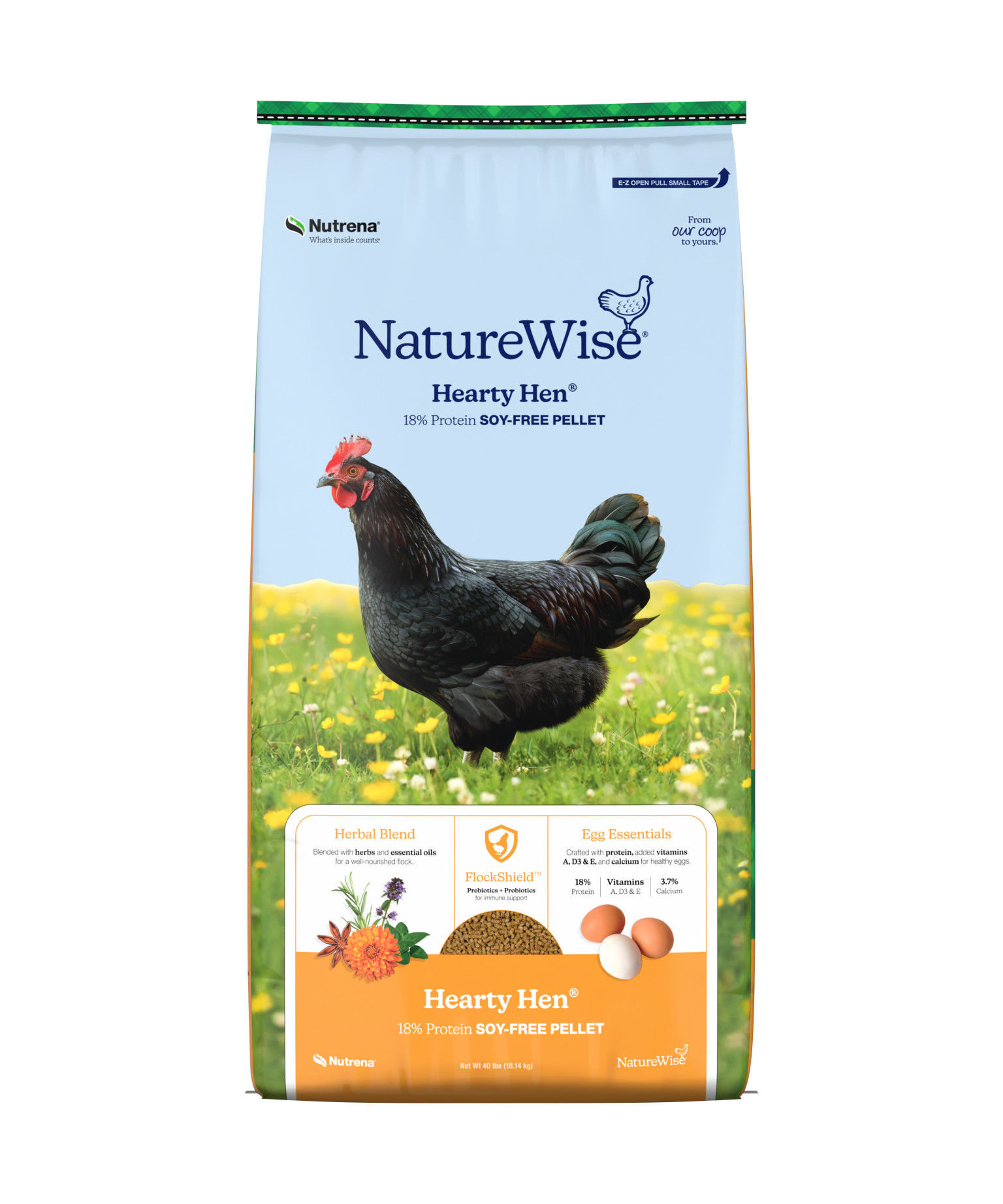 Nutrena® NatureWise® Hearty Hen 18% Protein Soy-Free Pellet is crafted for the backyard birds you call family. With 18% protein and Omega-3 from flax seed, it provides complete soy-free nutrition to support strong shells and bright yolks. Enriched with vitamins A, D₃, and E plus 3.7% calcium, it helps your hens stay healthy and productive. The pellet form encourages natural pecking and reduces waste, while our Herbal Blend and FlockShield® promote immune health and digestion—everything your hens need for wholesome, healthy eggs.