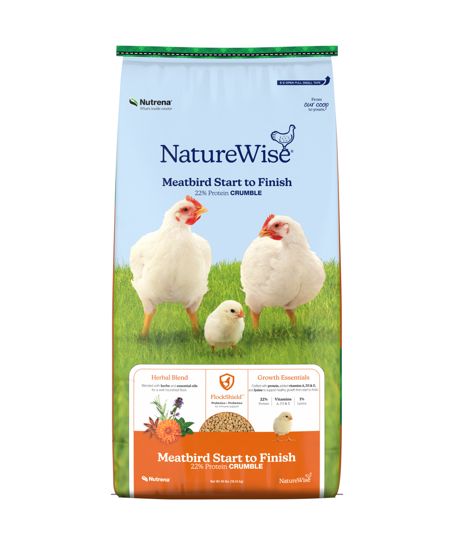 Nutrena® NatureWise® Meatbird Start to Finish 22% Protein Crumble provides complete nutrition for meatbirds from hatch to finish. With 22% protein and essential nutrients like lysine, vitamins A, D₃, and E, it supports robust growth, strong development, and efficient feed conversion. The crumble form is ideal for all stages, making feeding easy and minimizing waste. Fortified with our Herbal Blend and FlockShield® for immune health and digestion, this wholesome feed delivers everything your birds need for healthy, hearty growth—nothing more, nothing less.