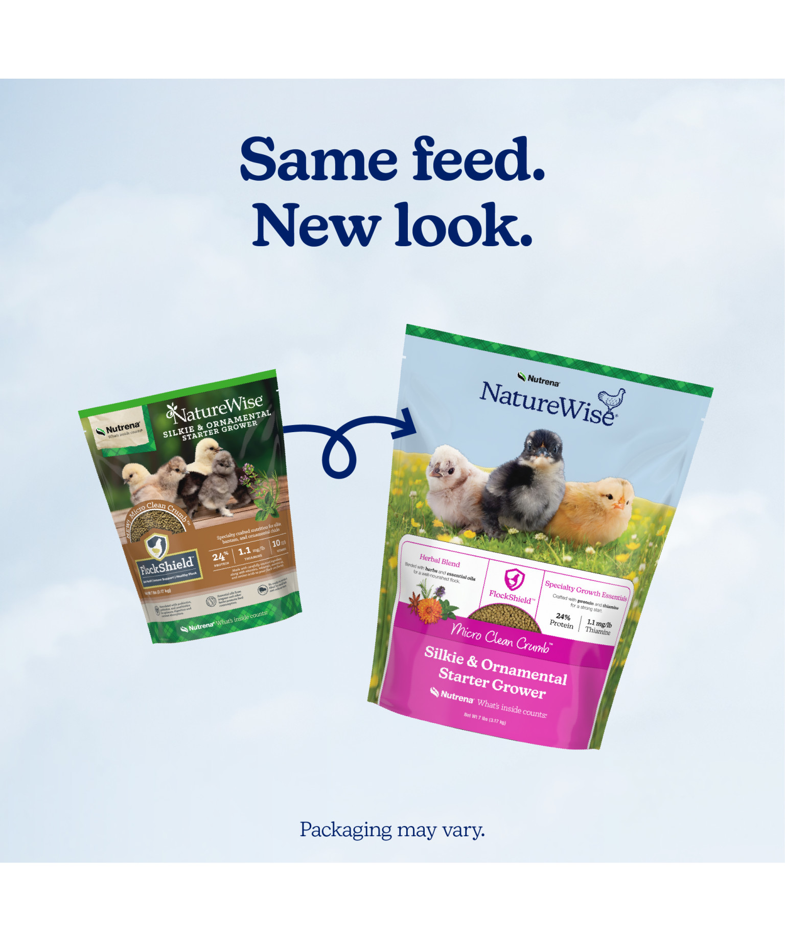 • Feed NatureWise® Silkie & Ornamental Chick Starter Grower 24% Micro Clean Crumb™ as the sole diet beginning at hatch